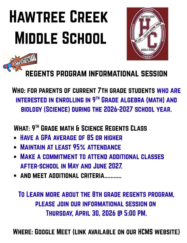 7th Grade Regents Informative Meeting via Google Meet at 5:00pm